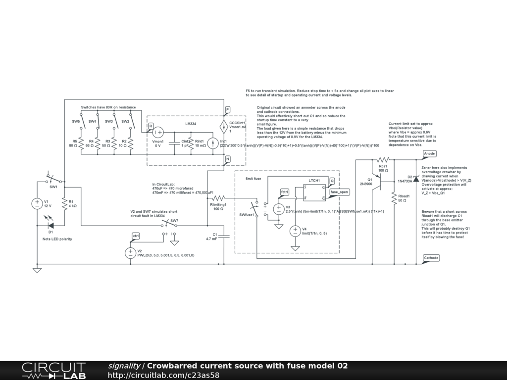 Same as "Crowbarred current source with fuse model" but with surge limiting resistor added between C1 and fuse.