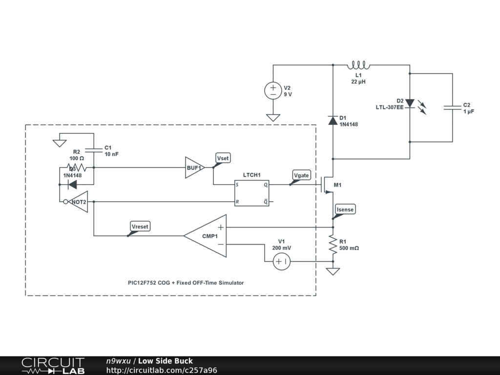 Simple Constant current low side buck power supply. The PWM block is a simulation of the COG or PSMC found in the PIC12F752 or PIC16F178x family of devices.