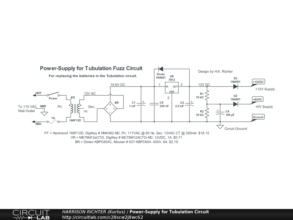 Power-Supply for Tubulation Circuit. Regulated power-supply providing +12V DC and +6V DC with current capability up to 350 mA. Purpose-designed for replacing the batteries in the Tubulation circuit.