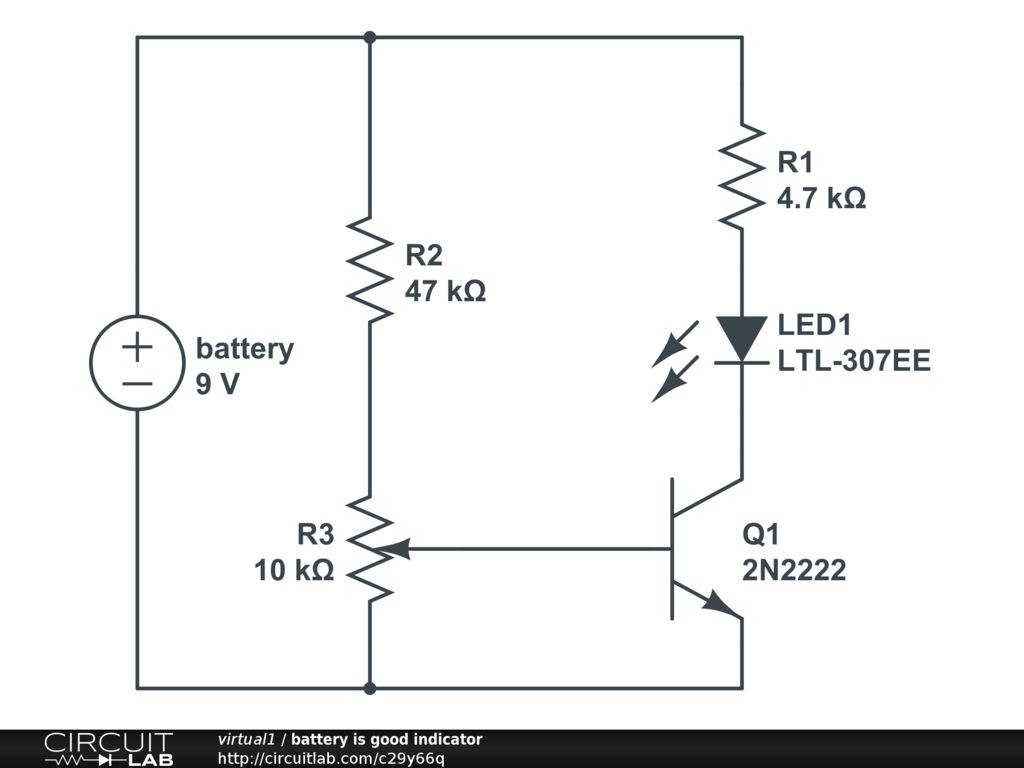 LED goes from green to off when battery drops below preset point. Transition is made within 1-2v, point adjustable with R3, designed to transition near 7v.