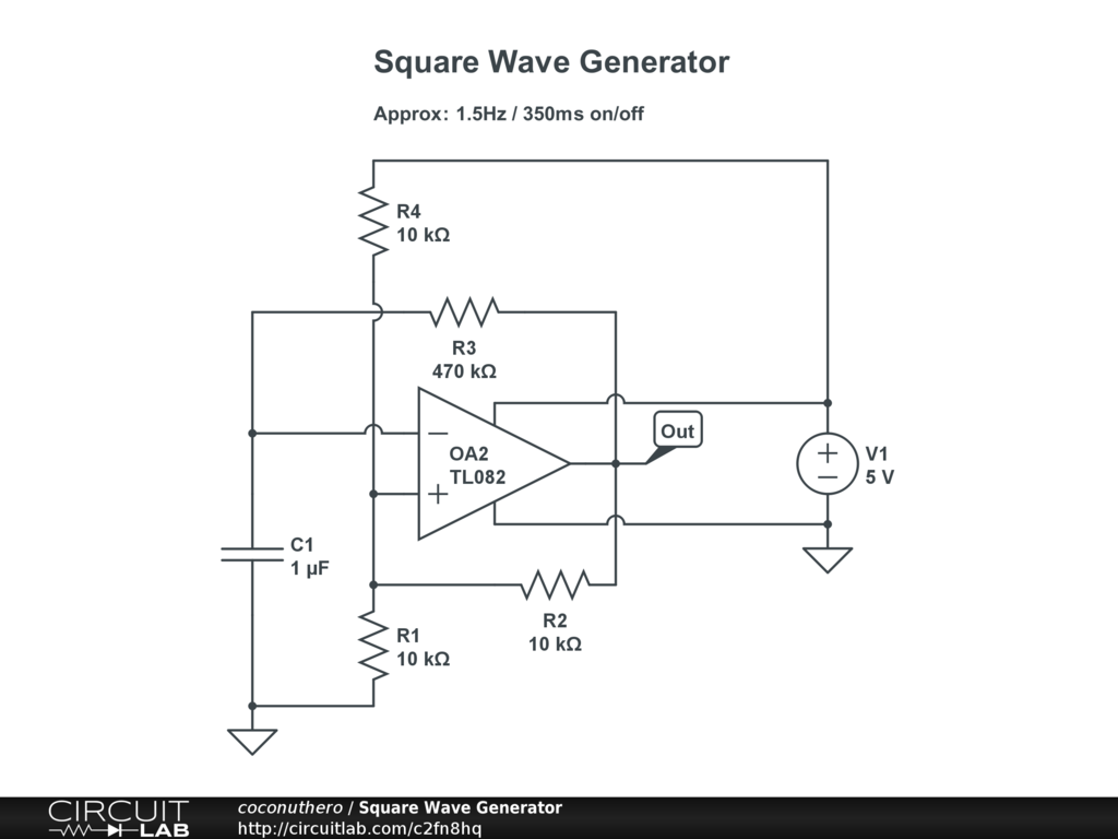 OPAMP-Square wave generator (astable Multivibrator). Only a positive power supply for the OPAMP is required. Frequency can be altered by changing values for R4 and C1.