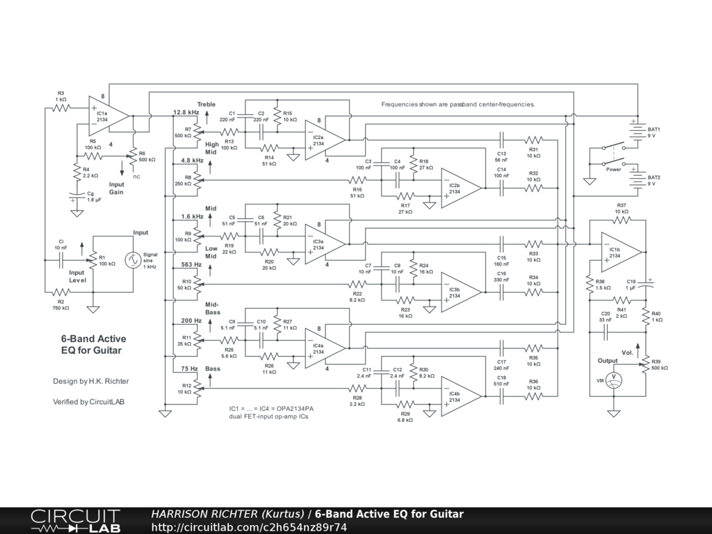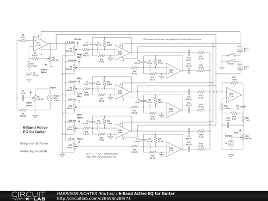 6-band active equalizer for electric guitar using FET-input op-amp ICs. Controls include: Input Level, Gain, Treble, High MId, Mid, Low Mid, Mid-Bass, Bass, and Volume. One op-amp is used for an input stage, providing initial gain, and the ohter in the same IC is for the output stage, in the form of a summing-amp. There are six bandpass filters with identical topologies but different part-values. Passband center-frequencies are shown. Recommended for rack-mount applications but can be a stomp-box project with sufficiently large box. Batteries can be replaced by a regulated dual-polarity +-9V DC power-supply providing 100 to 500 mA of available current. Though verified, treat the circuit as experimental. Breadboard test before committing to soldered build. Total circuit gains per frequency with all pots at middle positions, and using a 1 V p-p 1 kHz input signal, are; -9dBV @ 40Hz, 0dBV @ 50Hz, +6dBV @ 82Hz, +13dBV @ 160Hz, +16dBV @ 630Hz, +19dBV from 1kHz to 4kHz, +16dBV @ 10kHz, +13dBV @ 15kHz, and +9dBV @ 20kHz. Absolute maximum total circuit gain = +38dBV from 1kHz to 4kHz. Thus, circuit emphasizes mid to high frequencies in the ideal range for 6-string electric guitar; from 82Hz to 15kHz. Not suitable for 7/8-string guitars or 4/5/6-string bass.