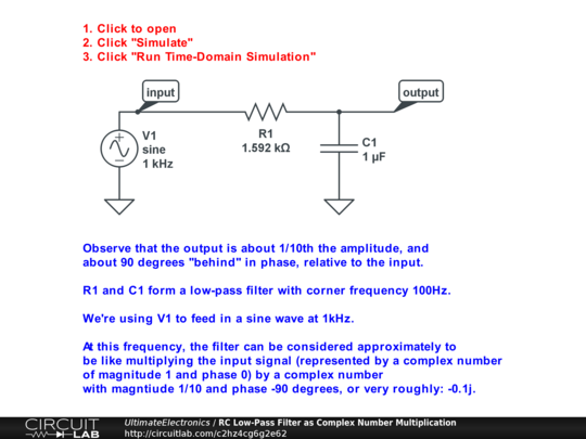 This example is from the Complex Numbers chapter of Ultimate Electronics Book. It demonstrates a change in amplitude and phase through an RC lowpass filter, and in the book, we explain how this relates to a complex number multiplication.