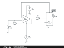 el circuito es un oscilador senoidal construido en torno a un amplificador y un filtro paso-banda. A la frecuencia del pico de resonancia,el desfase salida -entrada es nulo y el amplificador compensa la atenuación del filtro