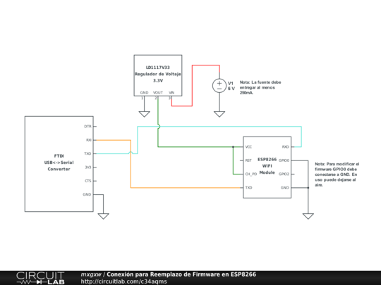 Aunque se utilice un FTDI funcionando a 3.3V tomar en consideración que el módulo WiFI puede tener picos de corriente de hasta 200mA, el regulador integrado en el FTDI no es capaz de otorgar tanta corriente y puede provocar un comportamiento errático.