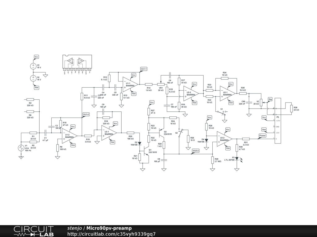 Reverse-engineered circuit diagram of the Boston Accoustics Micro90pv pre-amplifier board. Including voltage sources for simulations. When simulating this, it seems the gain in this preamp is very low. Uncertain if everything is correct around the signal path of the second op-amp