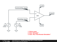 This example is from the The Ideal Op-Amp (Operational Amplifier) chapter of Ultimate Electronics Book. Using two different sine wave frequency generators connected to the op-amp's two outputs, we demonstrate how the op-amp with voltage rails can be used as an analog voltage comparator.