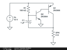Two transistors form a simple oscillator that drives a speaker creating an audible tone.