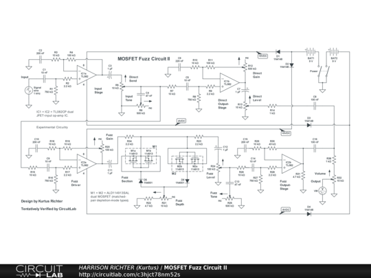High-gain MOSFET fuzz circuit for guitar. Uses two TL082CP dual JFET-input op-amp ICs for gain and drive, and two dual depletion-mode MOSFET ICs configured as hard-clipping diodes for obtaining fuzz. Depletion-mode MOSFETs have the reputation of sounding more like saturated electron-tubes than enhancement-mode MOSFETs. Controls Include: Direct Send, Input Tone, Direct Gain, Direct Level, Fuzz Gain, Fuzz Depth, Fuzz Tone, Fuzz Level, and Volume. The Fuzz and the Direct signals are in parallel and are mixed at the Output. Suitable for stomp-box or rack-mount applications. The batteries can be replaced by a regulated dual-polarity +-9V DC power-supply providing >= 30 mA of current. The range is from < 40 Hz to > 20 kHz. Circuit is good for 6/7/8-string guitar or 4/5/6-string bass, but with emphasis on upper-mids and highs above 250 Hz. Maximum gain = +31.4 dBV from 2.5 kHz and above with all controls at 50%, or +55 dBV from 400 Hz and above with all controls at 100%, except for Fuzz Depth and both Tone controls remaining at 50%. Fuzz Depth has little effect on gain, and the two Tone controls have little or no effect when set >= 50%, but have significant effects both on bandwidth and gain when set < 50%, with the most dramatic effect when both are at 0%.