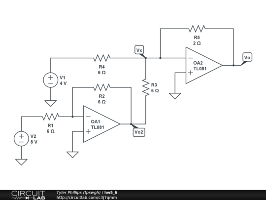 Two op-amp, differential amplifier with two input voltage sources.