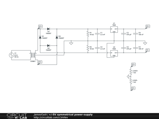Provides +/-5Vdc from a 9-0-9 step-down transformer.