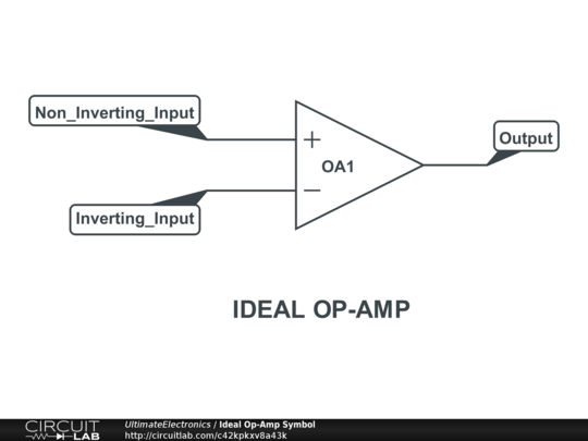 This example is from the The Ideal Op-Amp (Operational Amplifier) chapter of Ultimate Electronics Book. It shows the three terminals of the ideal op-amp: non-inverting (+) input, inverting (-) input, and output.