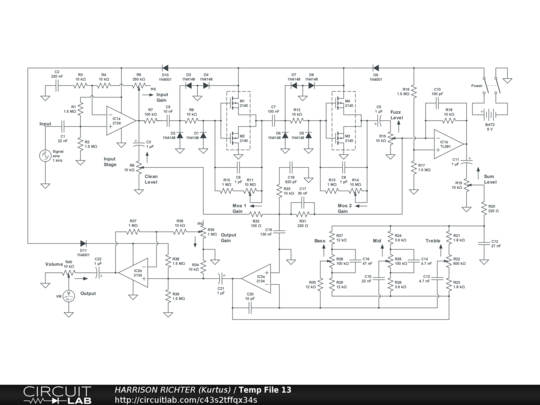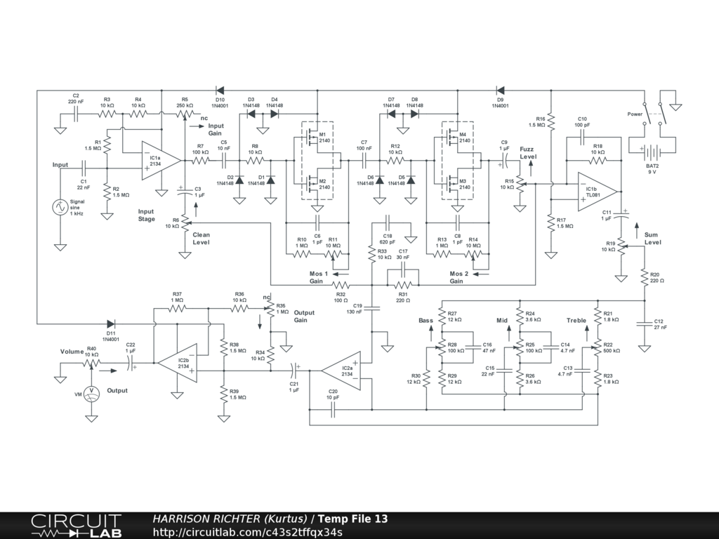 High-gain MOSFET fuzz circuit with 3-band tone. Two dual series-connected N-channel enhancement-mode MOSFET ICs are overdriven to generate tube-like fuzz. Controls Include: Input Gain, Clean Level, MOSFET Pair 1 Gain, MOSFET Pair 2 Gain, Fuzz Level, Clean + Fuzz Sum Level, Bass, Mid, Treble, Output Gain, and Volume. Range between high and low -3 dBV corners, with all controls at 50%, is from 17.6 Hz to 7.7 kHz. Range at or above 0 dBV, with all controls at 50%, is from 20 Hz to 6.3 kHz. Suitable for 6/7/8-string guitar or 4/5/6-string bass. Maximum gain = +23 dBV @ 325 Hz with all controls at 50%, or + 67.2 dBV @ 1 kHz with all controls at 100%, at which range extends from 8 Hz to 100 kHz. Do not use circuit with all controls at 100% except as a brief worst-case scenario while breadboard testing. The circuit can be a stomp-box or rackmount project. The battery can be replaced by a regulated single-polarity +9VDC power-supply. And though simulator verified, treat the circuit as experimental in nature. Thoroughly breadboard test it before committing to a soldered build.