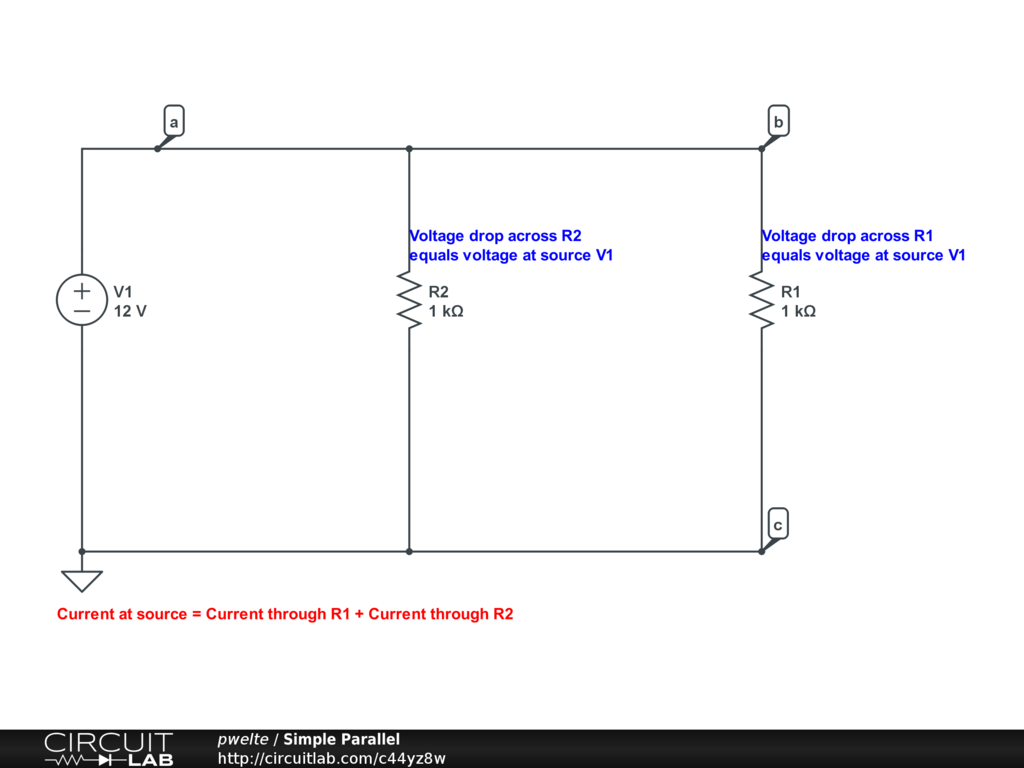 Simple parallel circuit for demonstrating voltage and current behavior to intro students.