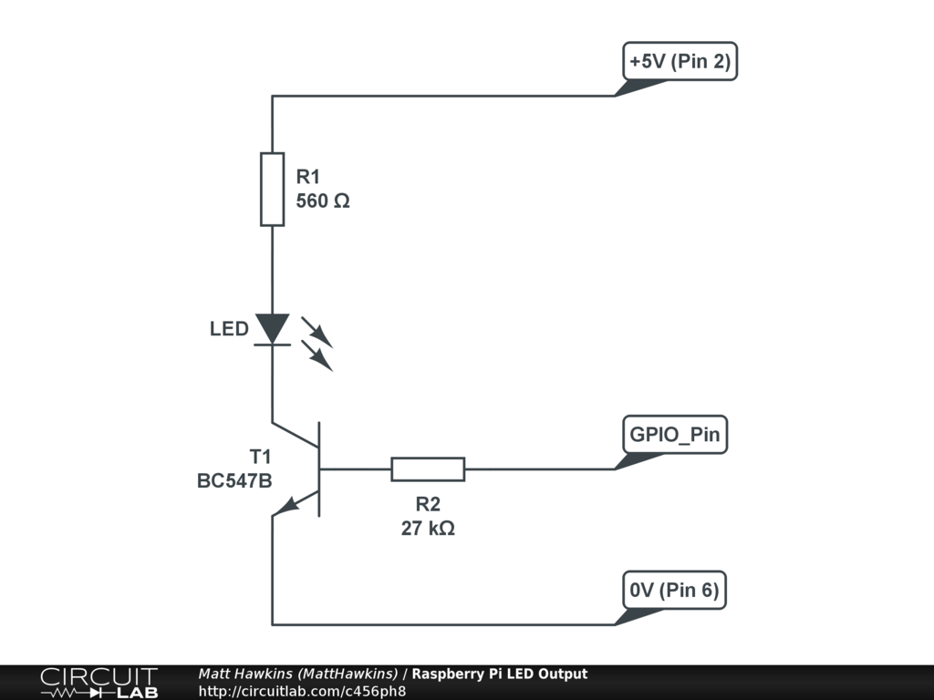 The Raspberry Pi can power LEDs directly from the GPIO Pins but this technique is useful as it allows you to power a range of other devices such as buzzers and motors. So this circuit isn't the best method for powering an LED if that is your only objective but it useful for experimenting. |