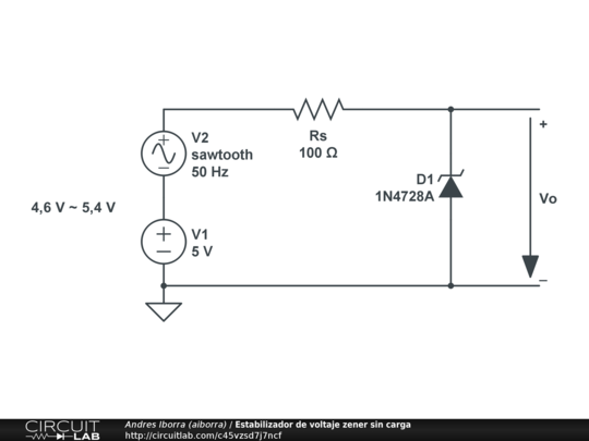 En la figura se muestra el típico circuito estabilizador de tensión zener. El objetivo es obtener una tensión de salida Vo mucho más estable que la de la fuente de tensión de entrada V1. En nuestro caso, tenemos una fuente de tensión de 5V poco estable en el tiempo, ya que puede variar entre 4,6 y 5,4V, y pretendemos obtener una tensión más estable y siempre algo superior a los 3,3V de tensión nominal del diodo zener utilizado.