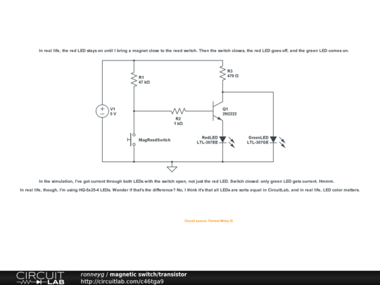 I'm learning that real life LEDs of different colors have different properties. On the breadboard, I can't swap the green LED for the red LED. Circuit won't work. I can swap the red LED for a yellow one and the green LED for a blue one, though. I think I found that a white LED worked in place of the green one also.
