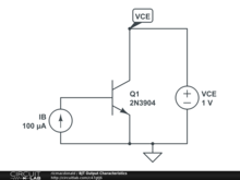 Simple circuit to plot the Output Characteristic of a BJT (Bipolar Junction Transistor). Can be easily adapted for other transistors or devices or to observe the effects oc changing the parameters.