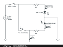 Award winning design. When the device is turned off, the LED if off. When the device is turned on, the LED turns green. When the device's fan is turned on (this is probably controlled by a simple temperature bi-metal switch), the LED turns orange. The LED never looks red.