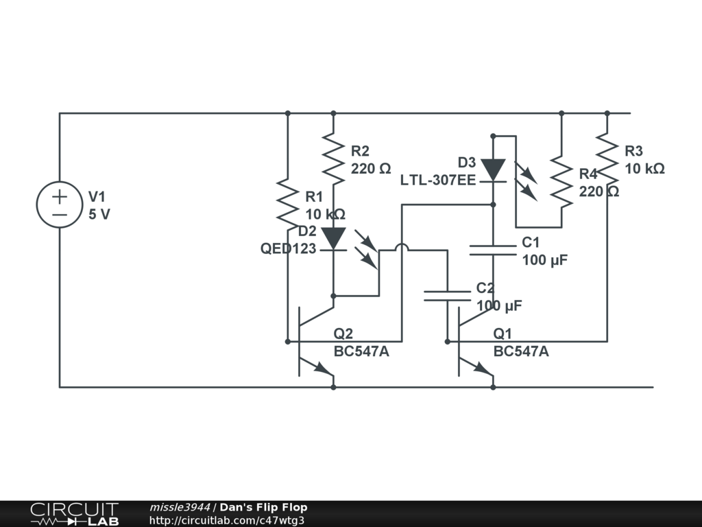 My first flip flop circuit on the circuit lab. Might breadboard this one too if it works on the c lab (circuit lab)