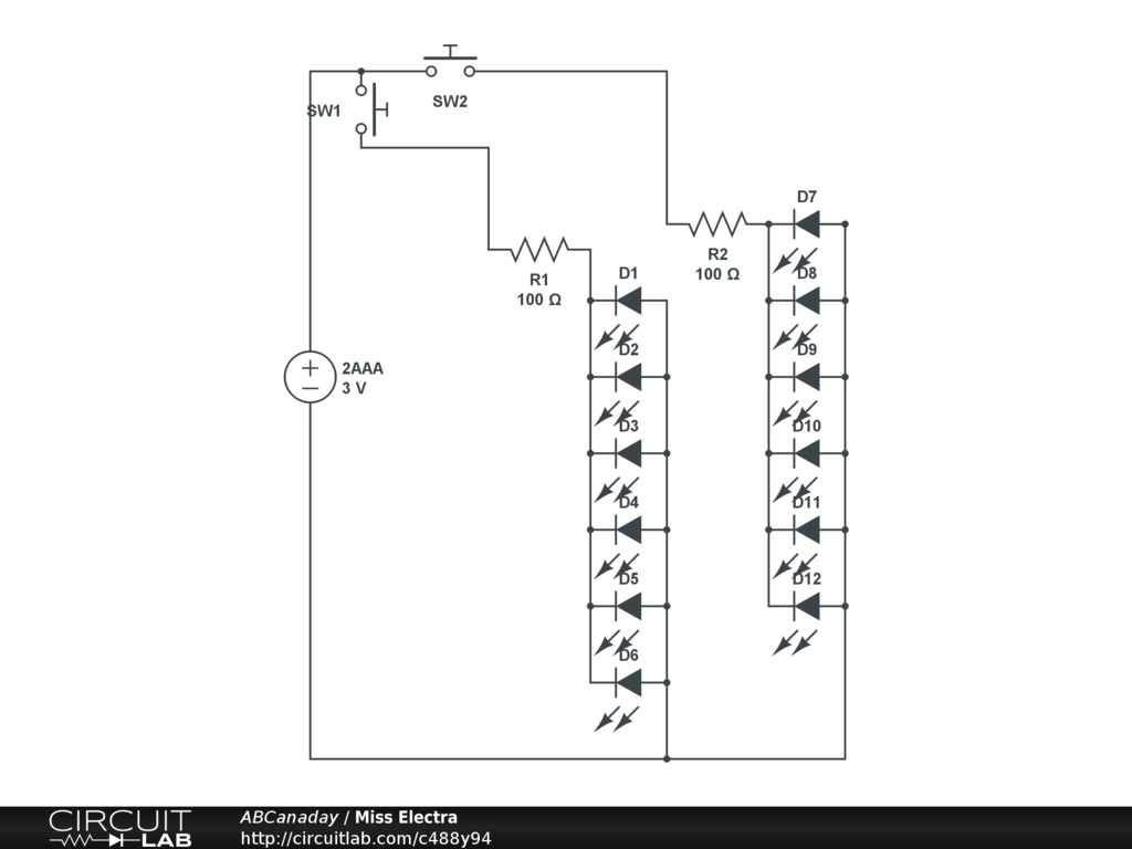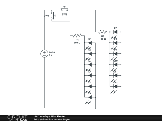 HELP! I'm a costume designer for a non-profit art center and am trying to design a 4-button switch series for an actress to be able to light up various parts of her costume. (FYI - "Miss Electra" from the musical "Gypsy.") I am using two prescription pill bottles with push button switches in the lids, battery packs and protoboards inside, and cables trailing out and to the back of the costume to wire the lights together. "Miss Electra" has to light up in at least 3 separate spots on her costume, each one independently operated by a momentary switch. If anyone has any helpful ideas for me, please let me know!! |
