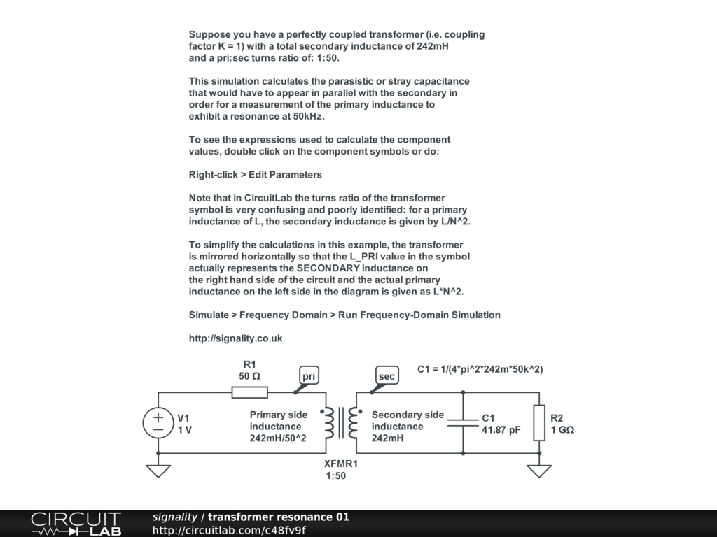 This simulation calculates the parasistic or stray capacitance that would have to appear in parallel with the secondary in order for a measurement of the primary inductance to exhibit a resonance at 50kHz.