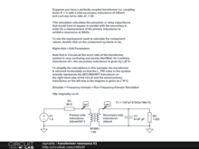 To simplify the calculations in this example, the transformer is mirrored horizontally so that the L_PRI value in the symbol actually represents the SECONDARY inductance on the right hand side of the circuit and the actual primary inductance on the left side in the diagram is given as L*N^2.
