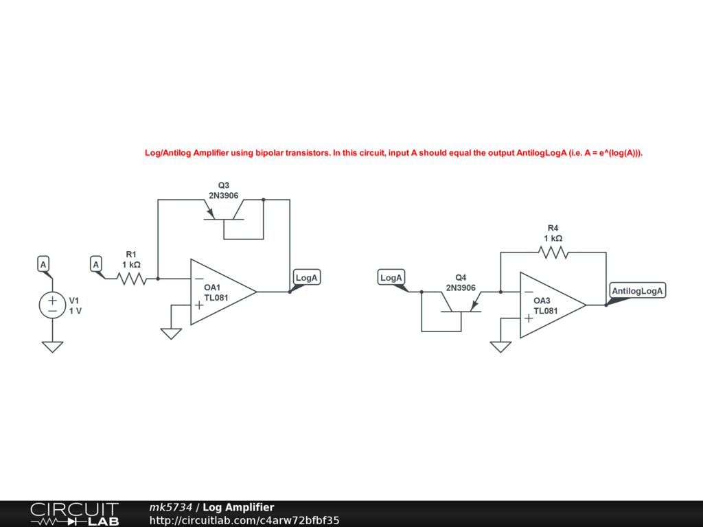 Example of a Logarithmic Amplifier using bipolar transistors instead of diodes.