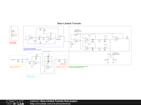 Square/Triangle LFO is fed into a Lin/Log slew limiter that powers a tremolo (Vactrol controlled amplifier)