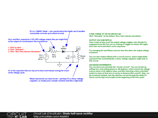 You can also try to simulate the "inrush current". You can do this by editing Vsrc and setting phase to -90 degrees, which means the voltage source starts at its highest value, and then inserting a time-controlled switch to close at time zero in series in between Rsrc and D1. Now, run the transient analysis, but also plot the current through the diode D1. Check out the big current spike at the beginning of the first cycle!