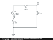 Un generatore di corrente ad onda quadra è collegato ad una bobina tramite dei resistori. Lanciando la simulazione si osserva che la tensione ai capi della bobina è costituita da una serie di picchi di tensione molto elevata che corrispondono al cambiamento di verso della corrente.