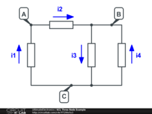 A simple circuit with four components and three nodes, with all currents labeled, is used to illustrate Kirchhoff's Current Law (KCL).
