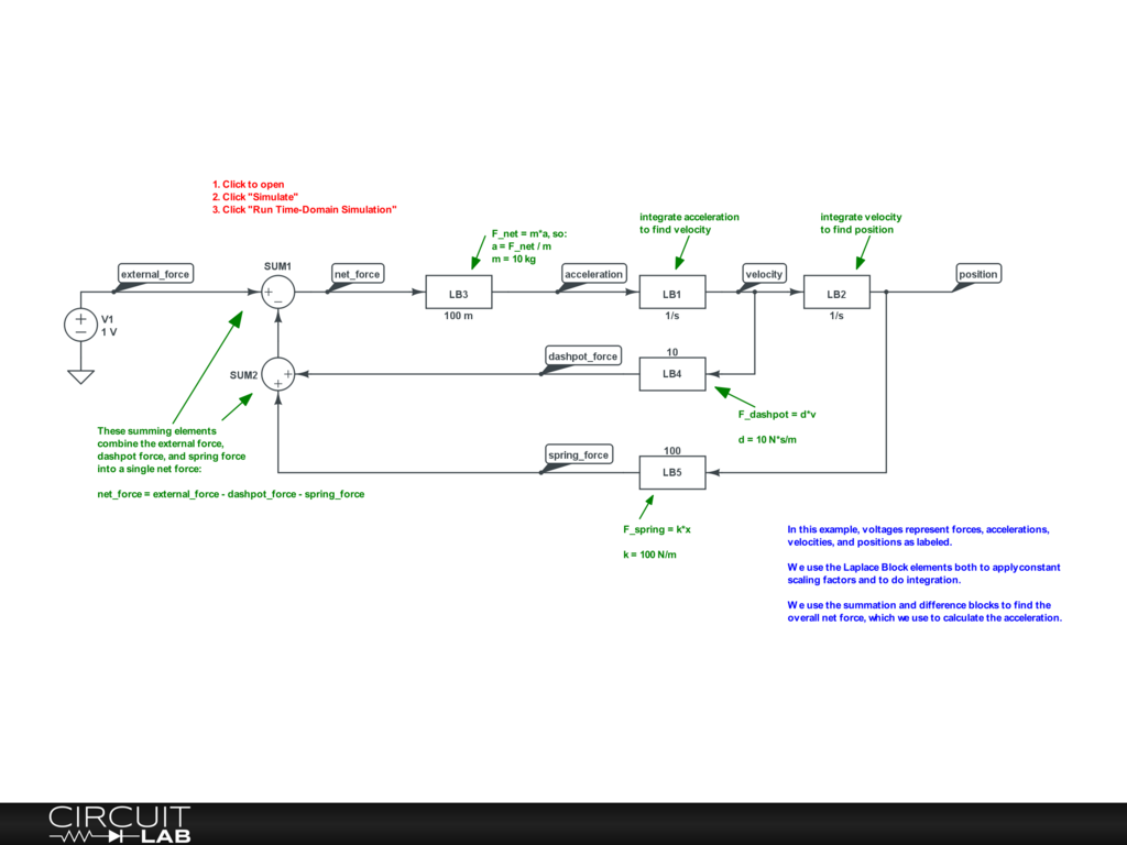 This example is from the Lumped Element Model chapter of Ultimate Electronics Book. Differential equations representing a spring-mass-dashpot mechanical system can be modeled with Laplace Blocks, used to create gain and integrators.
