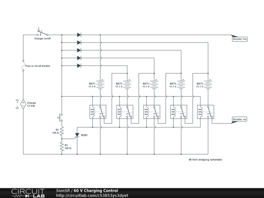 A simple circuit to allow five 11.1 volt packs of 18650 cells to be charged in parallel from a 12 volt supply; and deliver 55.5 volts when charged.