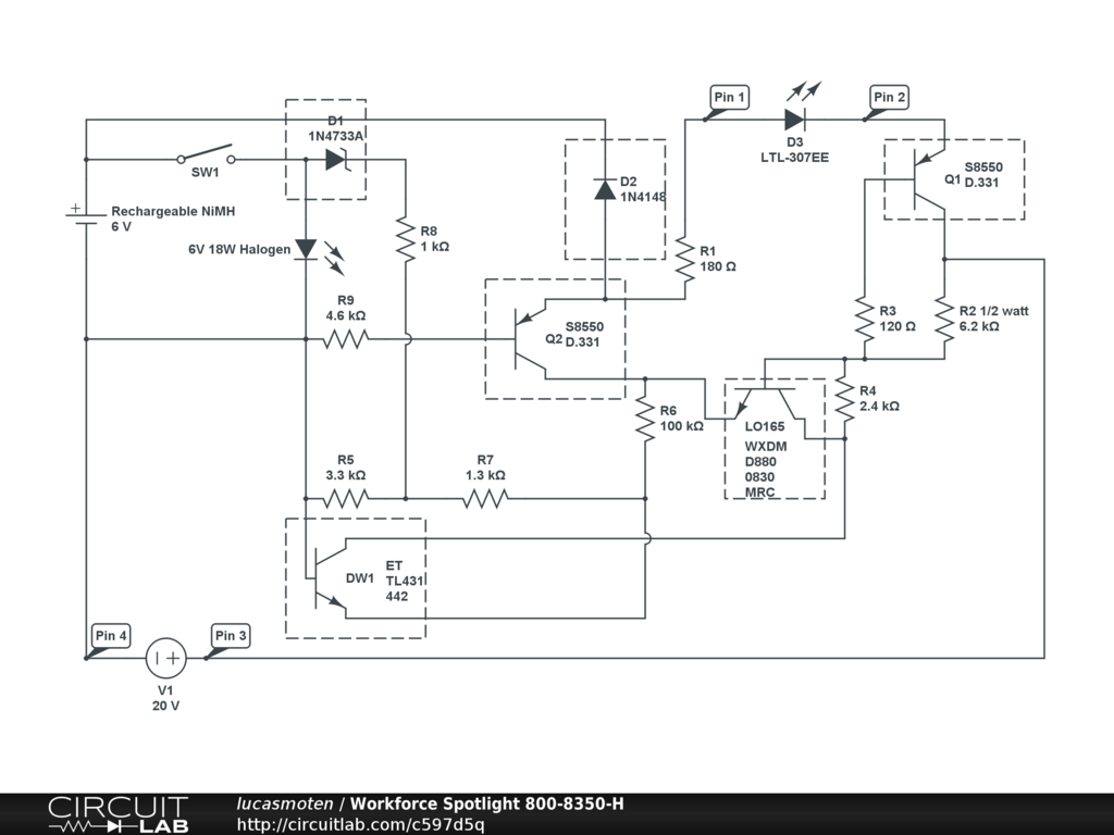 This circuit is based upon the Workforce Spotlight made in china and sold at Home Depot stores. I bought 2 of these. One worked ok, the other wouldn't hold a charge very long.So bummer, bad cells. And of course, the cells cost more to replace then the unit cost. I hate these disposable rechargeable products. So, now I'm debating on salvaging it for parts, but I need to determine what each of the parts are before doing so!.