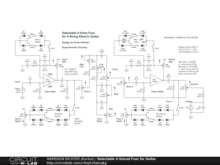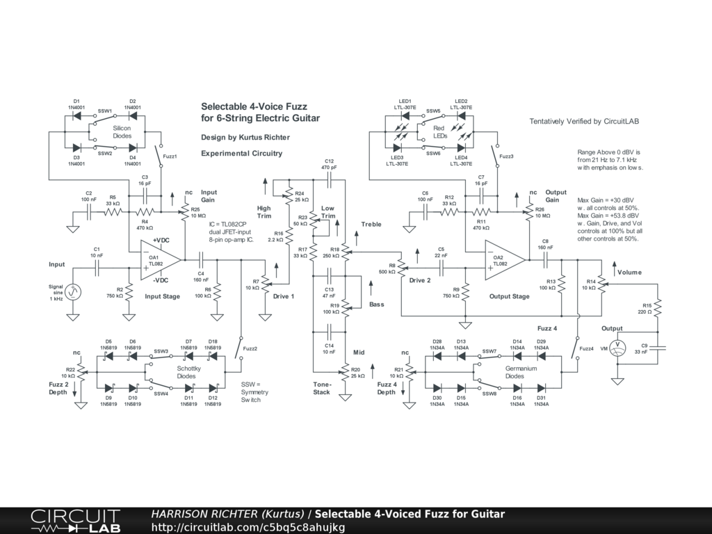 Selectable 4-voiced diode-fuzz circuit for 6-string electric guitar. The four fuzz voices are from four types of diodes; germanium, Schottky, standard silicon, and LEDs. The germaniums and LEDs are in soft-clip arrays, and the Schottky and standard diodes are in hard-clip arrays. There are two stages, each with one soft-clip and one hard-clip diode array, with a modified Fender-style tone-stack between the stages. Controls Include: Input Gain, Fuzz 1 enable switch, Fuzz 1 symmetry switches, Fuzz 2 enable switch, Fuzz 2 symmetry switches, Fuzz 2 Depth, Drive 1, High Trim, Low Trim, Bass, Mid, Treble, Drive 2, Output Gain, Fuzz 3 enable switch, Fuzz 3 symmetry switches, Fuzz 4 enable switch, Fuzz 4 symmetry switches, Fuzz 4 Depth, and Volume. Range above 0 dBV is from 25 Hz to 6.3 kHz, with emphasis on the lows and mids below 2.5 kHz. Maximum gain = +30.2 dBV (Vo/Vi = 32.4) @ 100 Hz with all controls at 50%, or +53.8 dBV (Vo/Vi = 489.8) @ 160 Hz with the Gain, Drive, and Volume controls at 100% but all other controls at 50%. With fuzz disabled, circuit will perform as an overdrive suitable for 6-string guitar in standard tuning, but with highs falling rapidly above 2.5 kHz. The low -3 dB reference is 19 Hz. The high -3 dB reference is 8.4 kHz.
