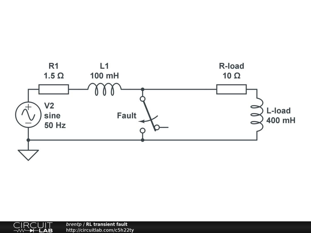 This circuit provides a simple example of an AC source and load, with a line impedance, where a short-circuit fault occurs across the load.