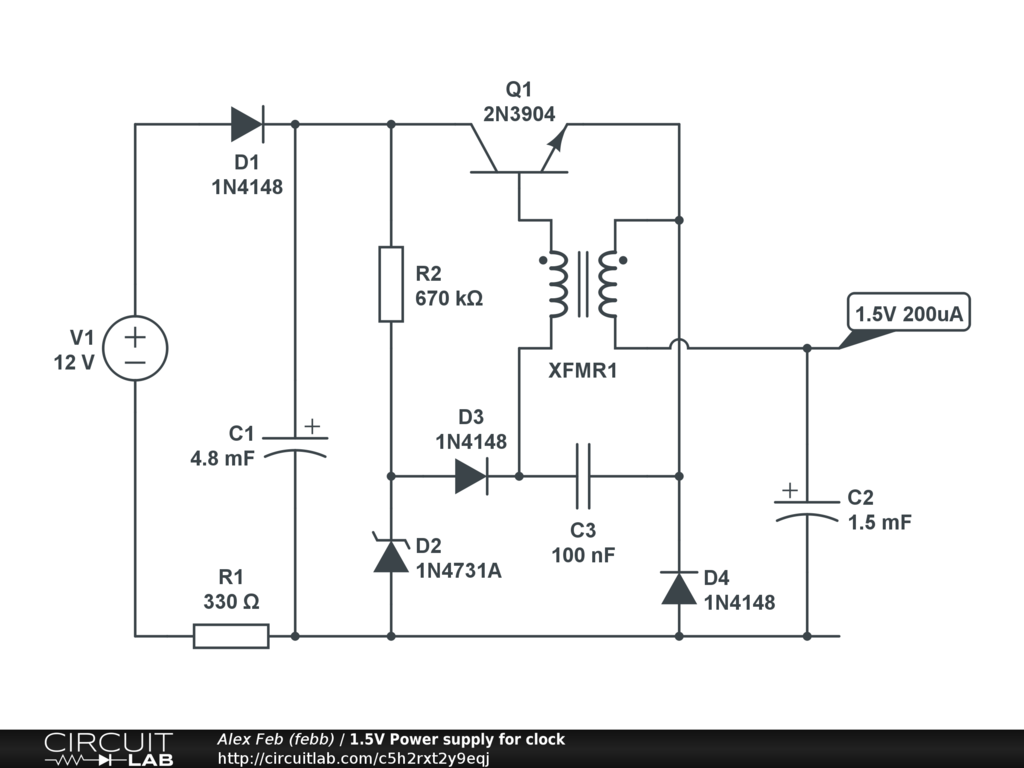 1.5V Power supply for clock with 30 min backup capacitors.