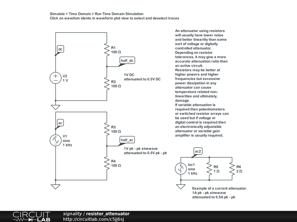 A student asked if resistive attenuators can be used for AC as well as DC. This is a simple demonstration showing resistors used to attenuate both a DC and a 1kHz signal by a factor of 2 (a gain of 0.5). Some of the pros and cons of resistor attenuators are briefly introduced. The resistors are assumed to be ideal so the high frequency effects of their parasitic capacitances are not shown. However it is easy enough to add them if anyone wants to play with the simulation.