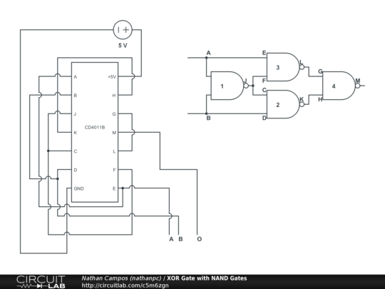 Create a XOR gate using NAND gates. A CD4011B was used as an example.