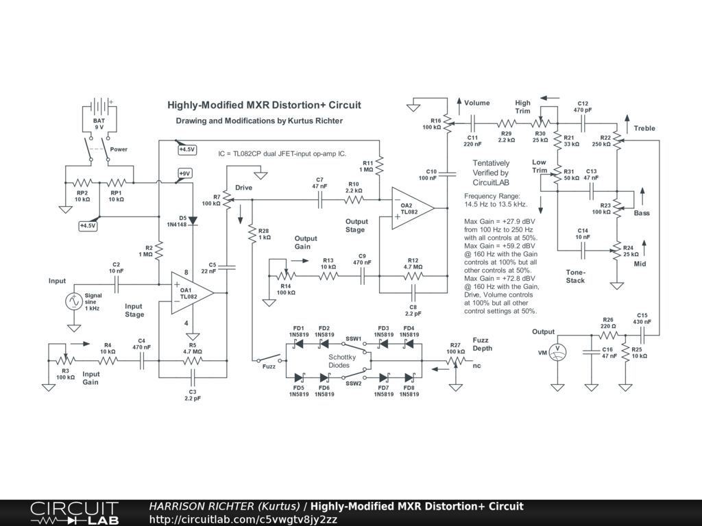 Highly-modified MXR Distortion+ circuit, featuring Fender-style 3-band tone-stack with customized part-values. Controls include: Input Gain, Drive, Fuzz enable switch, Fuzz Symmetry Switches (SSW), Fuzz Depth, High Trim, Low Trim, Bass, Mid, Treble, and Volume. Primary modifications are; two gain stages instead of one, addition of the tone-stack, High Trim, and Low Trim controls, use oi Schottky diodes instead of standard silicon or germanium types, adjustment of component values to optimize response, and the relabeling of controls. Range > 0 dBV is from 14.5 Hz to 13.5 kHz. Circuit is good for 6/7/8-string guitar or 4/5/6-string bass, with emphasis on mids, but is recommended for the 6-string electric guitar in standard tuning. Maximum gain = +27.9 dBV (Vo/Vi = 24.8) between 100 and 250 Hz with all controls at 50%, or +59.2 dBV (Vo/Vi = 912) with the Gain controls at 100% but all other controls at 50%. Do not set all controls at 100% except as a worst-case test during breadboarding. The circuit can be the basis of either a stomp-box or rack-mount project. The battery can be replaced by a regulated single-polarity +9V DC power-supply providing >= 20 mA of current. Though verified, treat as experimental. Breadboard test before committing to a soldered build. And house completed project in a grounded metal enclosure.