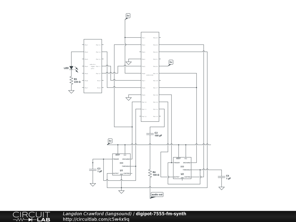 This circuits provides digital control of two 7555 astable oscillators configured for FM synthesis. Controlling this circuit requires a microcontroller running a small SPI program. The Arduino has an demo program in the examples menu.