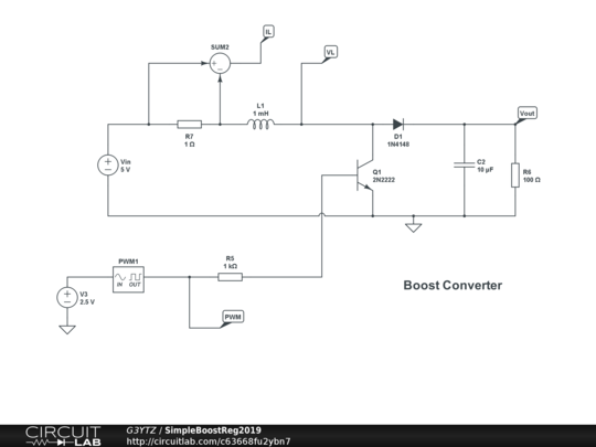 Simple boost regulator for education and learning. Experiment with Inductance, Capacitance, Duty cycle and PWM frequency.