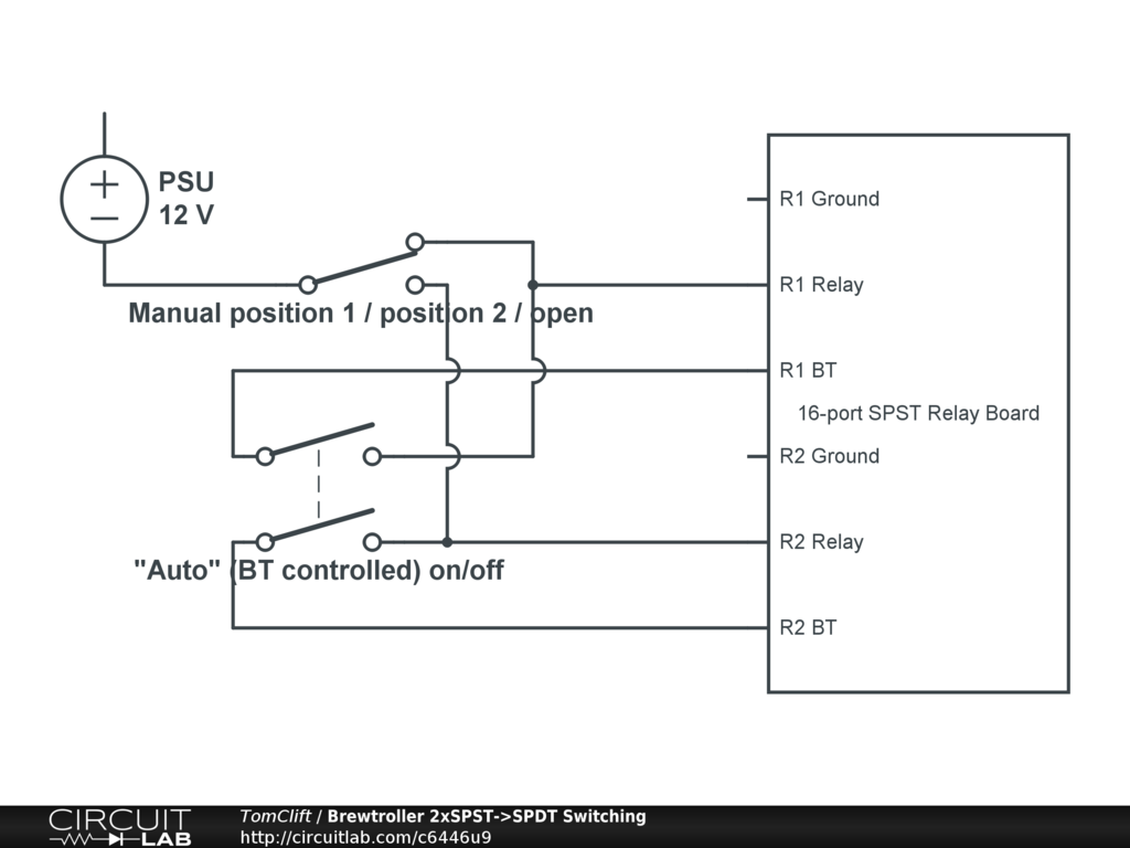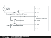 Switching for auto (BT controlled) / manual position 1 / manual position 2 using two SPST relays on the Brewtroller 16-port SPST relay board to control a single SPDT device (e.g. the KLD20S 3-way motorised ball valve, B3 wiring).