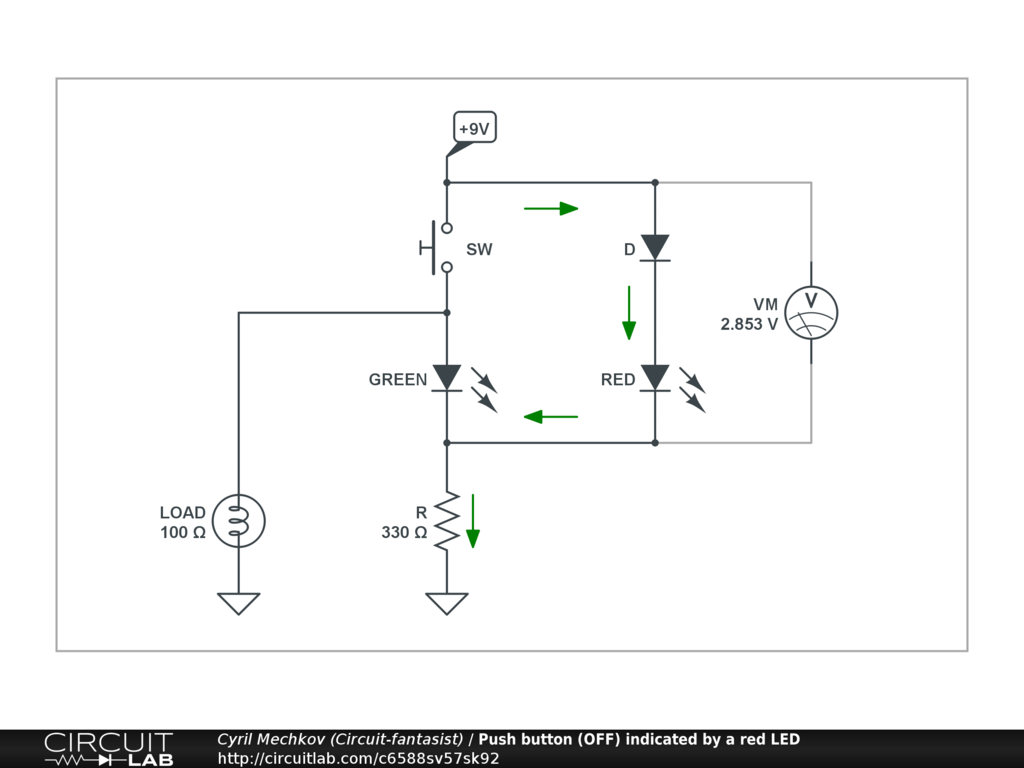 The button is OFF. Current flows through the red LED and it lights up. The total voltage across the string of two diodes is about 3V (I have connected the voltmeter only as a voltage indicator).
