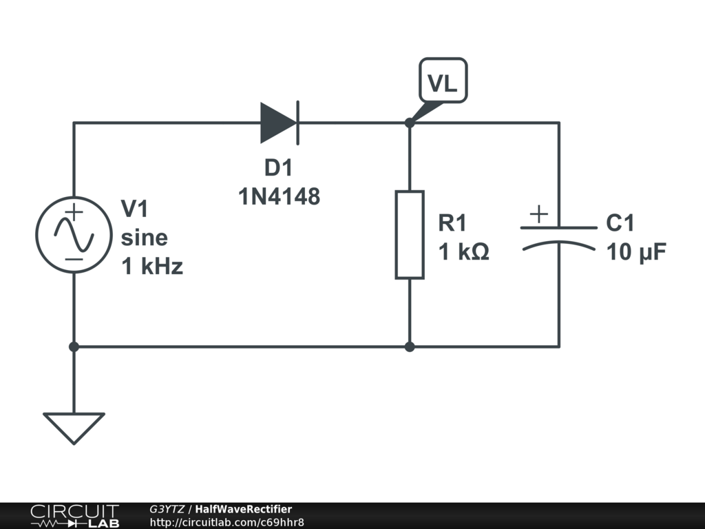Half wave rectifier with RC smoothing filter. Try different values of R and C to see the effect of smoothing. The diode current is also plotted.
