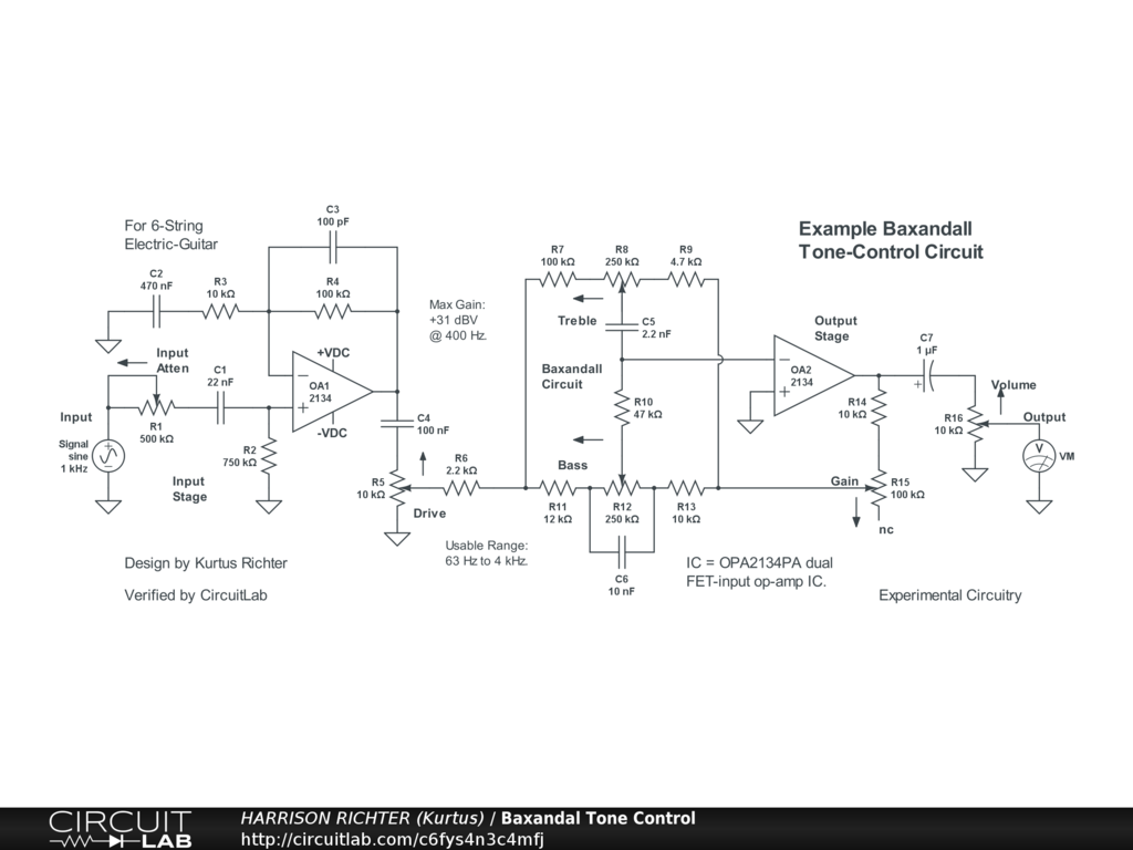 Example 2-band Baxandall tone-control circuit for electric guitar.