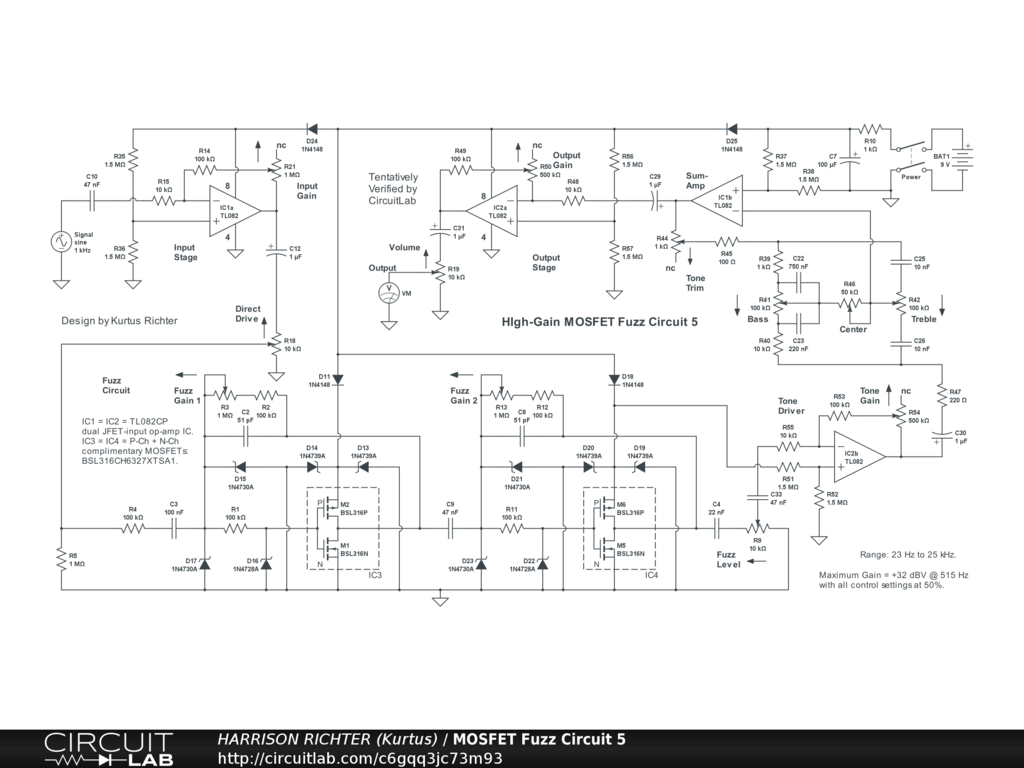 High-gain MOSFET fuzz circuit 5 for guitar. Uses two dual JFET-input op-amp ICs and two dual E-mode complementary MOSFET pairs; one P-channel one N-channel in the same package. Controls Include: Input Gain, Direct Drive, Fuzz 1 Gain, Fuzz 2 Gain, Fuzz Level, Tone Gain, Bass, Treble, Tone Trim, Output Gain, and Volume. The op-amps can be overdriven to add solid-state distortion to the fuzz sound. Range ab0ve 0 dBV is from 25 Hz to 25 kHz. Thus, the circuit is good for 6/7/8-string guitar or 4/5/6-string bass, with emphasis on mids. Maximum gain = +32 dBV @ 515 Hz with all controls at 50%. Circuit is suitable for stomp-box or rack-mount applications. The battery can be replaced by a regulated single-polarity +9V DC power-supply providing >= 50 mA of current. While simulator verified, treat the circuit as experimental. Breadboard test before committing to a soldered build.