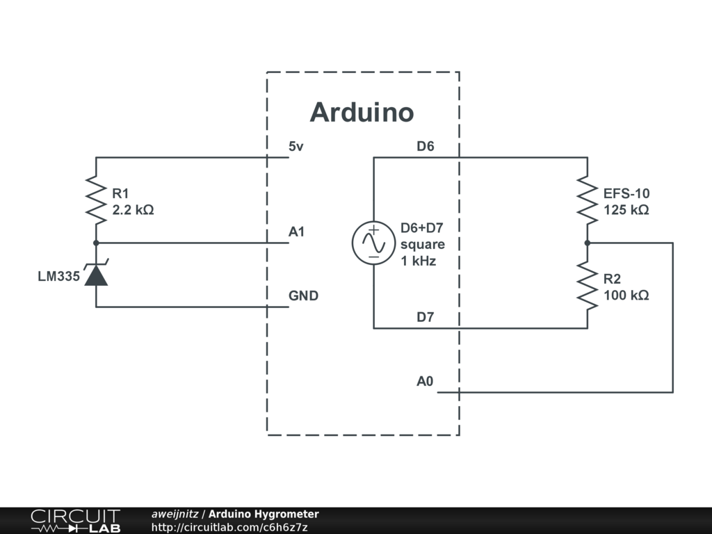 Illustration showing how to build an Arduino-based hygrometer using the EFS-10 humidity sensor in combination with an LM135 temperature sensor. Sketch to drive the circuit can be found here: https://github.com/aweijnitz/Hygrometer