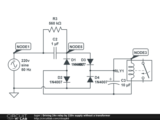 A circuit for 24v power supply without a transformer, the output voltage depends on relay resistnce, capacitors and R3.